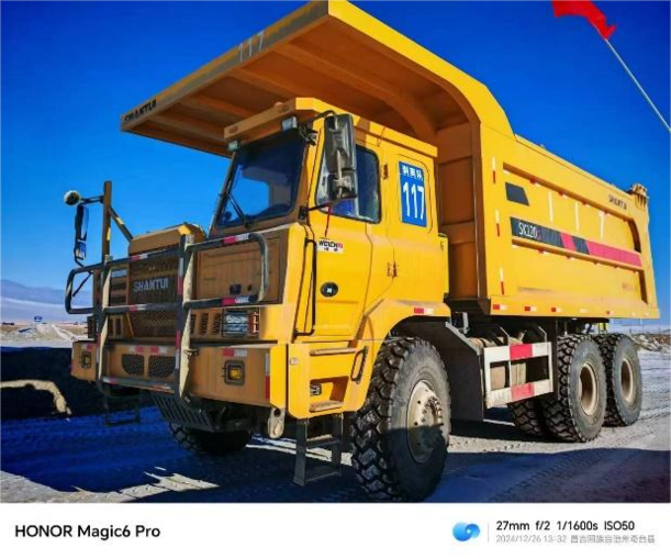 项目自2024年初启动,当前处于大规模剥离阶段,土方总量达1043.41万立方米,施工强度大、周期长。工程地处干旱荒漠地带,昼夜温差大,年均工作时间超过6000小时,对设备的出勤率和适应性提出了极高要求。面对高温、严寒、风沙等极端环境挑战,山推SK120-G展现出出色的稳定性与环境适应能力。车辆搭载的潍柴发动机、法士特变速箱及汉德车桥黄金传动系统,确保在8%坡度、4公里运输距离条件下依旧动力强劲,剥离阶段重载上坡平均速度可达13km/h,运输效率显著提升。