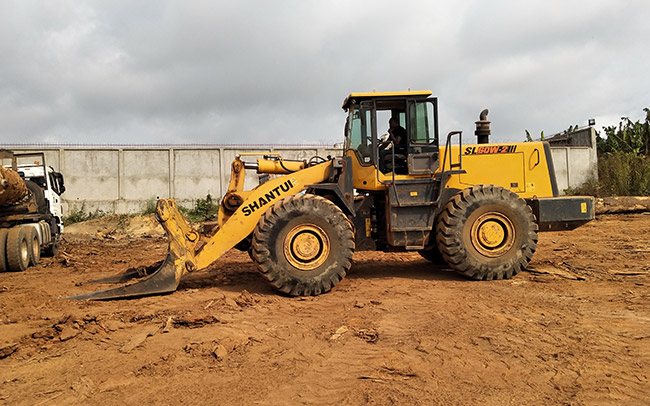 山推装载机工作于喀麦隆某公司堆场及林地,装配木料专用装卸属具。