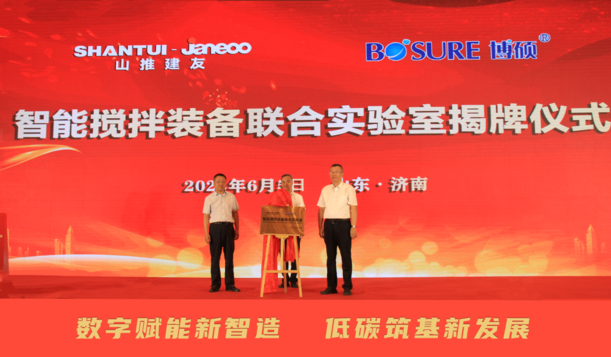 在中国混凝土与水泥制品协会执行会长吴文贵的见证下,山推建友、山东博硕智能搅拌装备联合实验室揭牌成功。